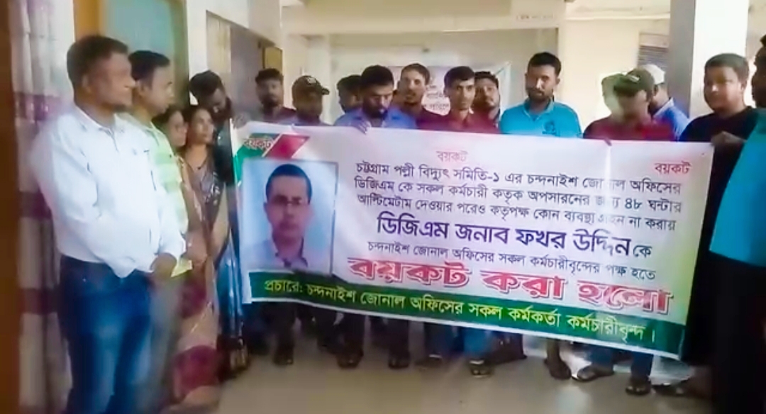 আরফাত হোসেন: চট্টগ্রামের চন্দনাইশে পল্লী বিদ্যুৎ কার্যালয় সম্মুখে ডিজিএমকে বয়কট করে কর্মসূচি পালন করেছেন চন্দনাইশে কর্মরত ৮৫ জন কর্মচারী। ১ আগস্ট ভোর ৬ টা থেকে দুপুর ১২ টা পর্যন্ত বিদ্যুৎ থাকবে না চন্দনাইশসহ সাতকানিয়া আংশিক এলাকায়। ৩১ জুলাই (বৃহস্পতিবার) সকালে চন্দনাইশ পল্লী বিদ্যুৎ কার্যালয়ের ডিজিএম মো. ফখর উদ্দিনকে বয়কট করে কর্মচারীরা কার্যালয় সম্মুখে কর্মসূচি পালন করেন। এ সময় আন্দোলনকারীরা বলেন, উনি ঠিক সবাই বেঠিক। তাই তারা জিএম বরাবরে ৮৫ জন কর্মচারী মিলে বিষয়টি বলার পরও তিনি কোন রকম সূরাহ না করে কাল ক্ষেপন করেছেন। তাই আমরা শান্তিপূর্ণভাবে মানববন্ধন করেছি। আমরা চাই তিনি স্বসম্মানে এখান থেকে চলে যাক, অন্যথায় আমাদের সবাইকে বদলী করে দেয়। এ ব্যাপারে ডিজিএম মো. ফখর উদ্দিন বলেছেন, তিনি পল্লী বিদ্যুতের যে আন্দোলন চলছে তিনি তাদের সাথে একমত না হওয়ার কারণে তারা কিছুটা ক্ষিপ্ত হয়েছেন। তাছাড়া তাদের আন্দোলনের কোন যুক্তি নেই। ঠিক সময়ে অফিসে আসে না, সঠিকভাবে কাজ না করার কারণে গ্রাহক হয়রানি হচ্ছে। তাদের আন্দোলন সঠিক নয়, আমি সঠিকভাবে কাজ করে যাচ্ছি, সবার সহযোগিতা চাই। চাঁদাবাজ, সুবিধাবাদীরা সুযোগ নিতে না পারায় তাদের সাথে হাত মিলিয়েছে আমাদের কতিপয় কর্মচারী। আশাকরি তারা তাদের ভুল বুঝতে পেরে সঠিকভাবে দায়িত্ব পালন করবেন। ভালো কাজ করতে গেলে অনেক বাঁধা বিপত্তির শিকার হতে হয়। এদিকে বিদ্যুৎ’র প্রধান লাইনে কাজ করার কারণে শুক্রবার (১ আগস্ট) ভোর ৬টা থেকে দুপুর ১২টা পর্যন্ত চন্দনাইশ, সাতকানিয়া এলাকায় বিদ্যুৎ থাকবেনা বলে জানিয়েছেন ডিজিএম মো. ফখর উদ্দিন।