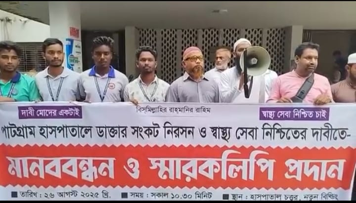 পাটগ্রাম হাসপাতালে চিকিৎসক সংকট নিরসন ও চিকিৎসা সেবা নিশ্চিত করার দাবীতে মানববন্ধন