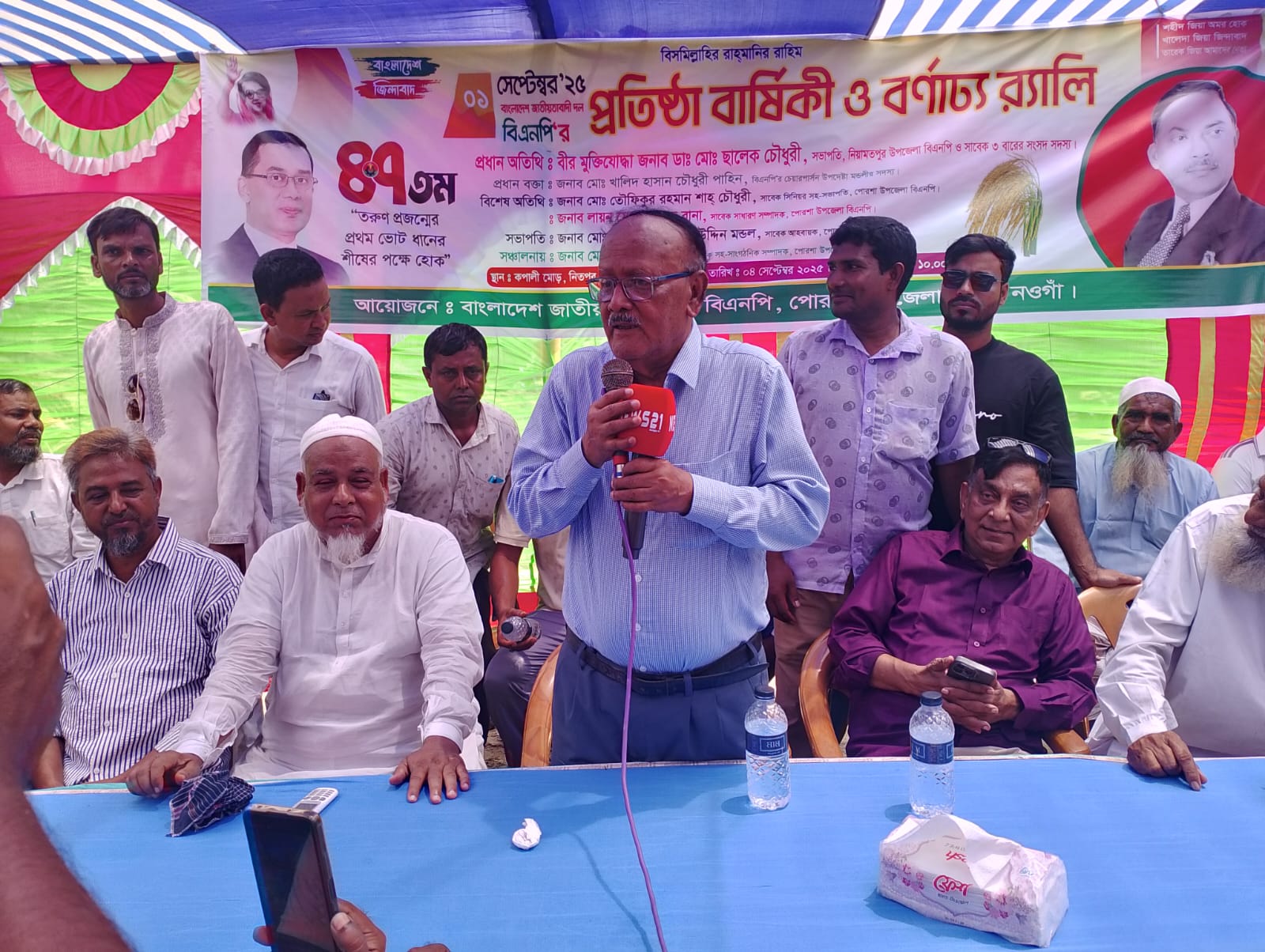 পোরশা(নওগাঁ)প্রতিনিধি: বিএনপির ৪৭তম প্রতিষ্ঠা বার্ষিকী উপলক্ষে নওগাঁর পোরশায় সাবেক সংসদ সদস্য ডাঃ ছালেক চৌধুরীর নেতৃত্বে সমাবেশ ও র্যালী অনুষ্ঠিত হয়েছে। বৃহস্পতিবার নিতপুর কপালীর মোড়ে উপজেলা বিএনপির আয়োজনে সমাবেশে সভাপতিত্ব করেন উপজেলা বিএনপির সাবেক আহবায়ক শফিউদ্দিন মন্ডল। প্রধান অতিথি ছিলেন নওগাঁ-১ আসনের সাবেক সংসদ সদস্য বীর মুক্তিযোদ্ধা ডাঃ ছালেক চৌধুরী। বিশেষ অতিথি ছিলেন উপজেলা বিএনপির সাবেক সিনিয়র সহসভাপতি তৌফিকুর রহমান শাহ চৌধুরী ও সাবেক সাধারন সম্পাদক লায়ন মাসুদ রানা। প্রধান বক্তা ছিলেন খালেদ হাসান চৌধুরী পাহিন। সমাবেশ শেষে একটি বিশাল র্যালি বের করা হয় এবং উপজেলা চত্বরে গিয়ে র্যালিটি শেষ হয়। সাবেক সহসাংগঠনিক সম্পাদক আজাহার আলী সঞ্চালনায় বিএনপি নেতা গোলাম রহমান, আব্দুল গণি, সানাউল্লাহ মন্ডল, যুবদল নেতা ইব্রাহীম কালু, আবুল কালাম আজাদ, ইকবাল শাহ্ চৌধুরী, ছাত্রদল নেতা শাহাজামান, রাকিবুল ইসলাম, ইসরাক আলী, সালাউদ্দিন আহম্মেদ, আত্হাার রহমান আপেল সহ স্থানীয় বিএনপি ও এর অংগ সংগঠনের নেতৃবৃন্দ উপস্থিত ছিলেন।