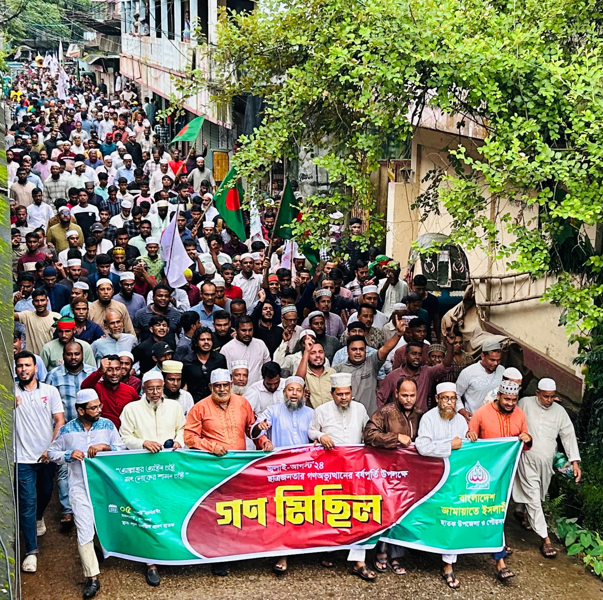 জুলাই-আগস্ট'২০২৪ ছাত্র-জনতার গণঅভ্যুত্থানের বর্ষপূর্তিতে ছাতক উপজেলা ও পৌর জামায়াতের উদ্যোগে গণ মিছিল আয়োজন করা হয়। মঙ্গলবার (৫ আগস্ট) শহরের লাল মসজিদের সামন থেকে শুরু হয়ে শহর প্রদক্ষিণ করে ট্রাফিক পয়েন্টে মিছিলটি সংক্ষিপ্ত সমাবেশের মাধ্যমে শেষ হয়। উপজেলা জামায়াতের আমীর মাওলানা আকবর আলীর সভাপতিত্বে উপজেলা জামায়াতের সেক্রেটারি হাফিজ জাকির হোসাইনের সঞ্চালনায় প্রধান অতিথির বক্তব্য রাখেন সুনামগঞ্জ-৫ (ছাতক-দোয়ারাবাজার) আসনে জামায়াত মনোনীত সংসদ সদস্য পদপ্রার্থী মাওলানা আব্দুস সালাম আল-মাদানী, শুভেচ্ছা বক্তব্য রাখেন পৌর জামায়াতের আমীর ইঞ্জিনিয়ার নোমান আহমদ, বিশেষ অতিথি হিসাবে বক্তব্য রাখেন সুনামগঞ্জ জেলা জামায়াতের কর্মপরিষদ সদস্য এডভোকেট রেজাউল করিম তালুকদার, মোঃ শাহ আলম, উপজেলা জামায়াতের নায়বে আমীর মাওলানা সৈয়দ মনসুর আহমদ, অন্যান্যর মধ্যে উপস্থিত ছিলেন পৌর সেক্রেটারী ডাঃ হেলাল আহমদ, উপজেলা সহ-সেক্রেটারী আব্দুল আউয়াল ও আবু মুসা রাসেল, উপজেলা শিবির সভাপতি মাসুদ আহমদ, পৌর শিবির সভাপতি তাজুল ইসলাম, ছাতক ডিগ্রী কলেজ শিবির সভাপতি আব্দুর রব নোবেল, গোবিন্দগঞ্জ আব্দুল হক স্মৃতি ডিগ্রী কলেজ শিবির সভাপতি মতিউর রহমান, ব্যবসায়ী আব্দুল হাই আজাদ, সুনামগঞ্জ জজ কোর্টের এপিপি এডভোকেট আলম উদ্দিন, উপজেলা শ্রমিক কল্যাণ ফেডারেশনের সভাপতি মিজানুর রহমান, পৌর শ্রমিক কল্যাণ ফেডারেশনের সভাপতি মাওলা নুরুল আমীনসহ উপজেলা ও পৌর জামায়াত শিবিরের নেতৃবৃন্দ।